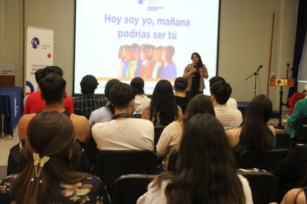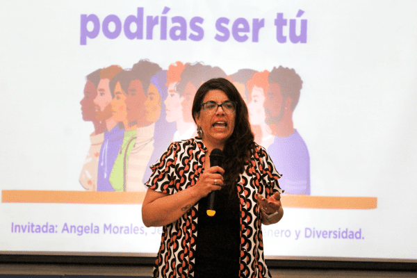 Estudiantes de Ingeniería Civil Industrial de la la asignatura "Trabajo en equipo y liderazgo", liderada por el profesor Sergio Bermúdez, organizaron y realizaron la charla "Hoy soy yo, mañana podrías ser tú" en la que expuso Ángela Morales, jefa de la Unidad de Género y Diversidad de la Universidad Central.