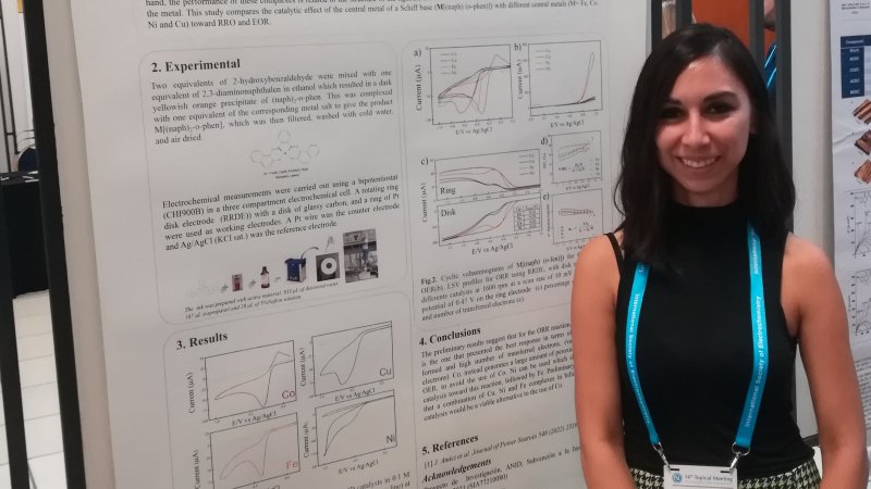 En la ocasión, la profesora presentó su trabajo "Effect of the central metal in Schiff bases for the electroreduction and evolution of oxygen for energy storage systems" del que presentó sus resultados, un estudio electroquímico del efecto catalítico de diferentes metales frente a la reacción de reducción y evolución de oxígeno. Los resultados preeliminares muestran que una combinación de complejos de cobre, niquel y hierro permitirían generar un catalizador bifuncional hacia reacciones de oxígeno. Estas reacciones son importantes para sistemas de almacenamiento de energías tales como las baterías de litio-oxígeno.