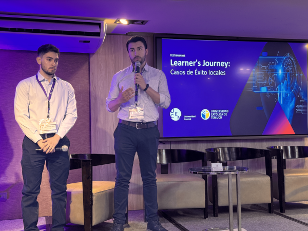 En ese contexto, y en una de las sesiones, Darok Orellana y Raúl Ibarra, estudiantes de Ingeniería Civil Industrial, fueron reconocidos por su dedicación y éxito en la certificación de Gestión de Proyectos de Google, obtenida a través de la alianza con Coursera. Sus testimonios, presentados en la sesión “Learner's Journey”, ilustraron cómo estas certificaciones fortalecen las competencias de los estudiantes y los preparan para responder con éxito a las demandas del mercado laboral actual.