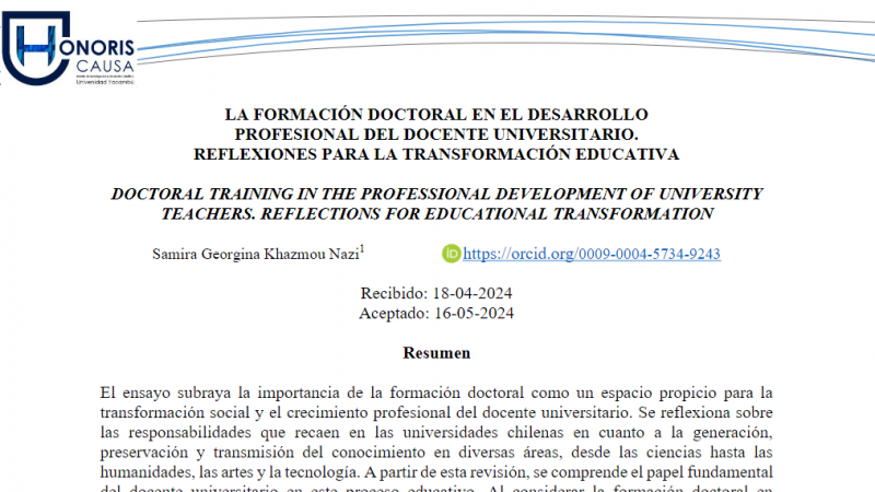 El texto, titulado "La formación doctoral en el desarrollo profesional del docente universitario. Reflexiones para la transformación educativa", pone el foco en temas como la importancia de la formación doctoral en el desarrollo profesional del docente universitario, destacando su papel en la transformación social y el crecimiento profesional.