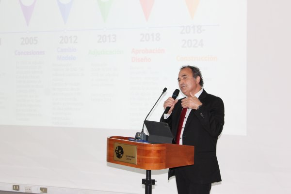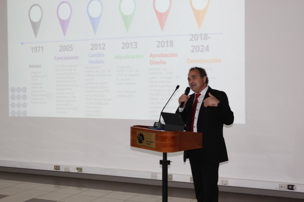 En una jornada que destacó por el diálogo que se dio entre las autoridades y los y las estudiantes, la presentación de los representantes del Ministerio de Obras Públicas mostró la cronología que ha marcado este desafío de infraestructura para el país, pasando desde la aprobación de la ley en el Congreso, su concesión, cambios de modelo, adjudicaciones, diseños y construcción.