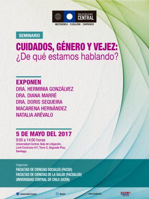 El 5 de mayo del 2017, entre las 9 y las 14 horas, se realizará en la Universidad Central el Seminario "Cuidados, Género y Vejez: ¿De qué estamos hablando?" organizado por la Facultad de Ciencias Sociales (FACSO) y la Facultad de Ciencias de la Salud (Facsalud).