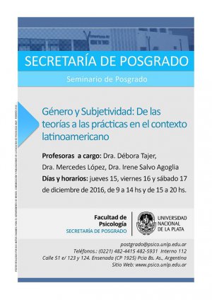 La académica de la Escuela de Psicología de la Facultad de Ciencias Sociales (FACSO) de la Universidad Central, Irene Salvo Agoglia, dictó – en conjunto con otras dos expertas- el Seminario de Postgrado "Género y Subjetividad: De las teorías a las prácticas en el contexto latinoamericano", entre el 15 y el 17 de diciembre en la Facultad de Psicología de la Universidad Nacional de La Plata (UNLP), Argentina.