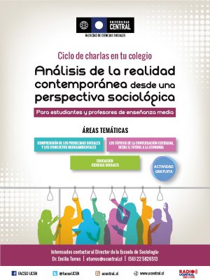 Los académicos de la carrera de Sociología de la Facultad de Ciencias Sociales de la Universidad Central iniciarán este mes un ciclo de charlas sobre “Análisis de la realidad contemporánea desde una perspectiva sociológica” el que será dictado en colegios y también en dependencia de la Universidad.