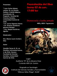Durante la visita institucional a la BUAP, se presentó en México el libro del profesor Dr. Osvaldo Torres G. "Democracia y Lucha Armada. MIR y MLN-Tupamaros". En la actividad participaron los académicos del ICSH, Dr. Carlos Figueroa Ibarra; Dra. Raquel Gutiérrez; y Dr. Octavio Moreno. Desde FACSO, comentó el Dr. Juan Carlos Gómez Leyton.