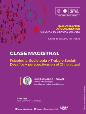 Con la clase magistral sobre "Psicología, Sociología y Trabajo Social: desafíos y perspectivas en el Chile actual" dictada por el doctor en sociología e investigador de la Facultad, Luis Eduardo Thayer Correa, la Facultad de Ciencias Sociales (FACSO) realizará el 20 de abril la ceremonia de inauguración del Año Académico 2017.