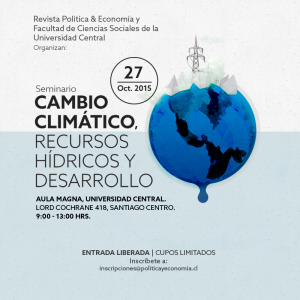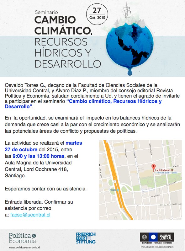 La Facultad de Ciencias Sociales de la Universidad Central y la revista Política y Economía, con la colaboración de la Fundación Friedrich Ebert (FES) realizarán el seminario "Cambio climático, recursos hídricos y desarrollo" en el que participarán el Ministro de Agricultura, Carlos Furche, y la senadora Isabel Allende, entre otras personalidades