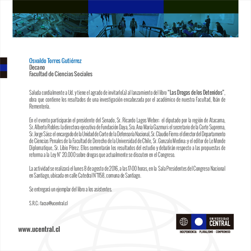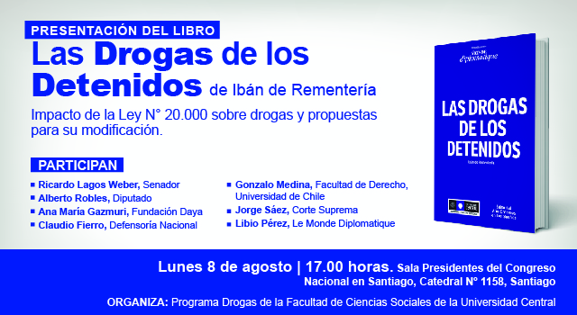 En el marco de la discusión que actualmente se desarrolla en el Congreso, con relación a la reforma a la Ley N° 20.000 de drogas, el Programa de Drogas de la Facultad de Ciencias Sociales de la Universidad (FACSO) de la Universidad Central de Chile presentó el libro "Las Drogas de los Detenidos" del académico Ibán de Rementería.