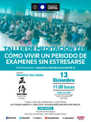 No requiere inscripción previa. Organizan: Escuela de Psicología y Dojo Zen de Santiago, SHO DEN, Sangha Kosen. Se sugiere llevar cojín de meditación o cojín firme.