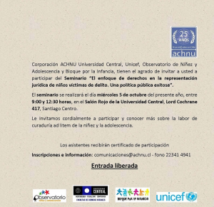 Corporación ACHNU, Universidad Central, Unicef, Observatorio de Niñez y Adolescencia y Bloque por la Infancia, tienen el agrado de invitar a usted a participar del Seminario "El enfoque de derechos en la representación jurídica de niños víctimas de delito. Una política pública exitosa".