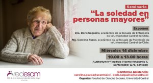 El miércoles 14 de diciembre de 10:00 a 13:00 horas se realizará el Seminario "La soledad en personas mayores" que se enmarca en los resultados del proyecto "Concepto subjetivo de soledad en personas de 60 y más años de la comuna de Santiago" (Proyecto de Investigación CIPSE).