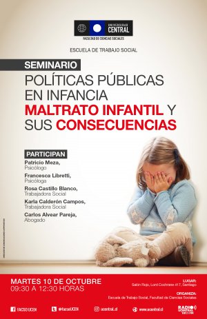 El 10 de octubre se realizará el seminario "Políticas públicas en Infancia; maltrato infantil y sus consecuencias", organizado por la Escuela de Trabajo Social de la Facultad de Ciencias Sociales de la Universidad Central de Chile.