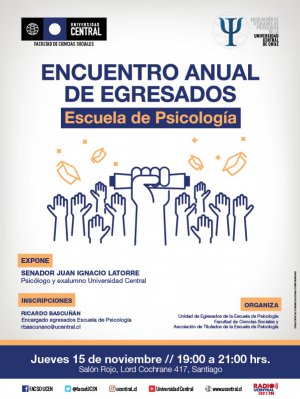 La Escuela de Psicología de la Universidad Central en conjunto con la Asociación de Titulados de la carrera realizarán la Reunión Anual de Egresados de esta Escuela que tendrán como principal invitado al senador por la Región de Valparaíso, y exalumno de la Escuela, Juan Ignacio Latorre.