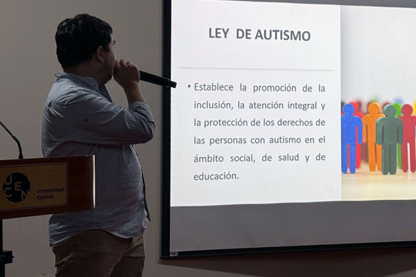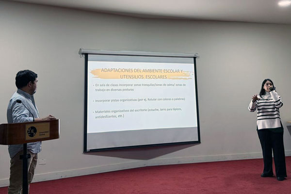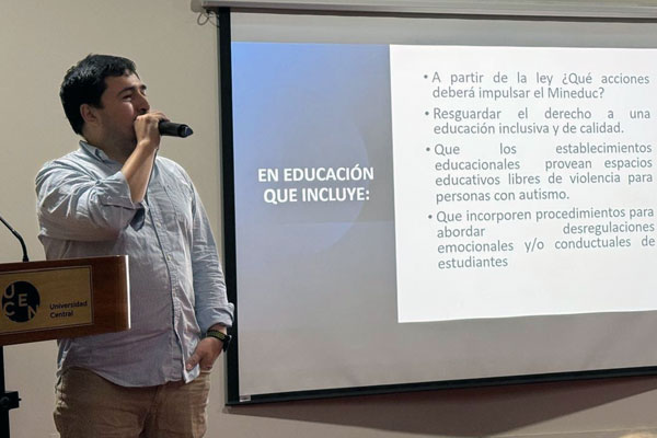 Los académicos Leonardo Vidal y Valentina Molina, de la carrera de Terapia Ocupacional (sede Santiago), participaron como expositores en la Jornada de Conceptualización de la Condición del Espectro Autista en el Contexto Educativo, organizada por la carrera de Pedagogía en Educación Diferencial de la Facultad de Educación (FED) de la Universidad Central de Chile (UCEN). La actividad se realizó el lunes 1 de julio y reunió a estudiantes y docentes de dicha unidad académica.