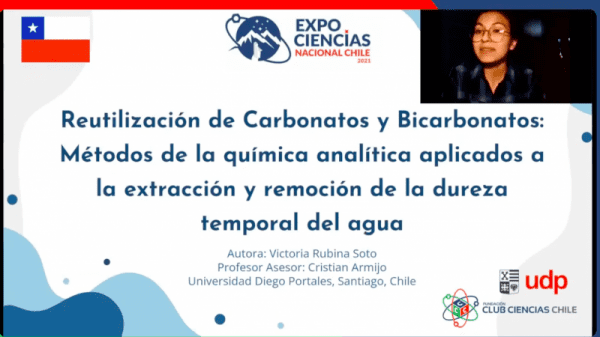 En la categoría de estudiantes universitarios el mejor lugar nacional lo obtuvo Victoria Rubina Soto y el profesor Cristián Armijo de la Universidad Diego Portales con el proyecto “Reutilización de carbonatos y bicarbonatos: Método de química analítica aplicados a la extracción y remoción de la dureza temporal del agua”, que les abrió las puertas para participar en la ExpoCiencias Nacional México 2022.
