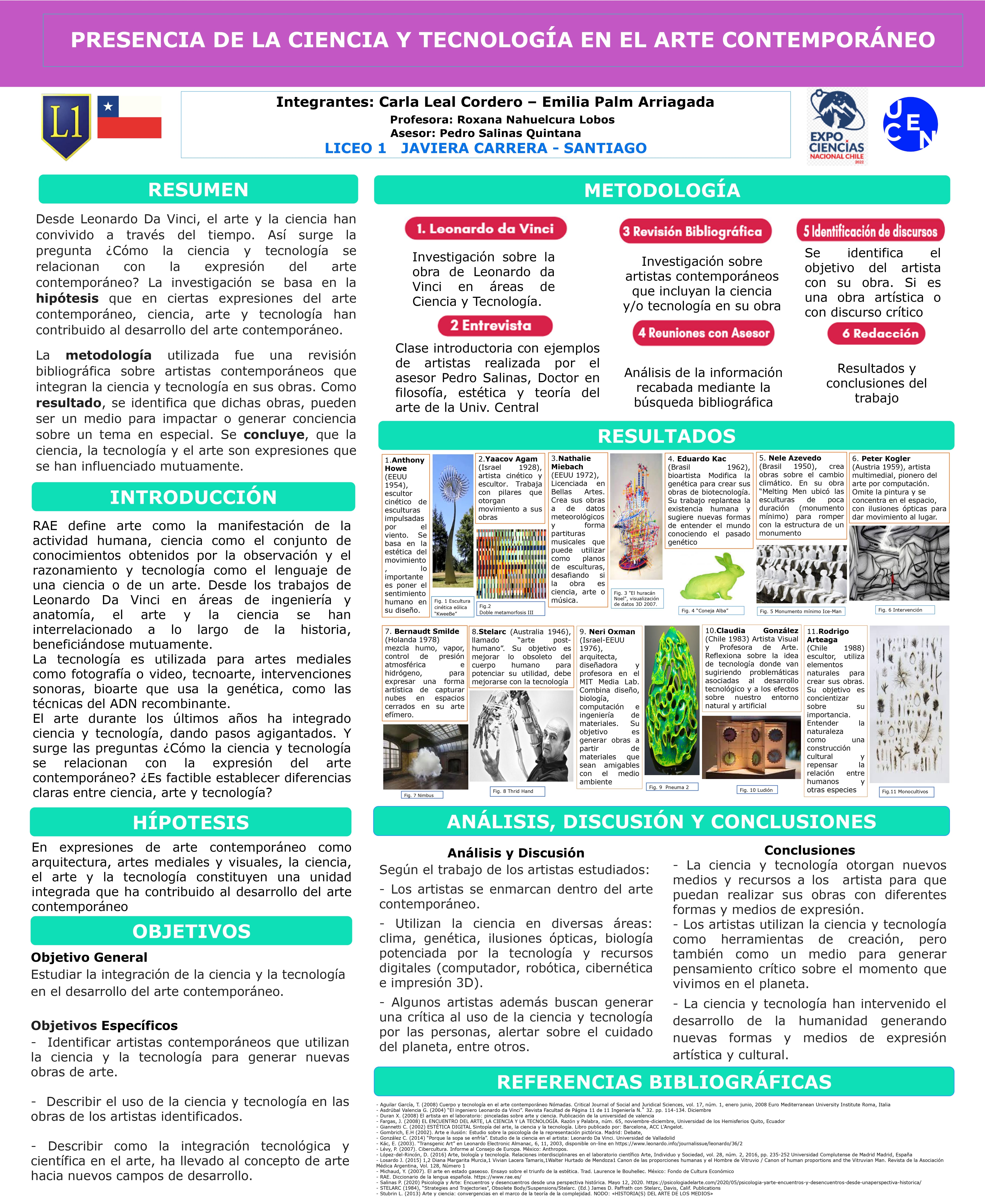 "El proyecto desarrollado por las estudiantes del Liceo 1, en conjunto con su profesora (Roxana Nahuelcura), realmente me ha sorprendido mucho no solo por el trabajo y compromiso demostrado, sino porque además, en su fondo teórico, es un proyecto que ha logrado demostrar cómo la ciencia, el arte y la tecnología nunca han sido dimensiones separadas en el desarrollo del conocimiento y la cultura". Con estas palabras el Dr. Pedro Salinas, investigador del Instituto de Investigación y Postgrado, describe su experiencia de participar como asesor experto junto a las estudiantes Emilia Palm Arriagada, Carla Leal Cordero y la profesora Roxana Nahuelcura del Liceo 1 Javiera Carrera de Santiago.