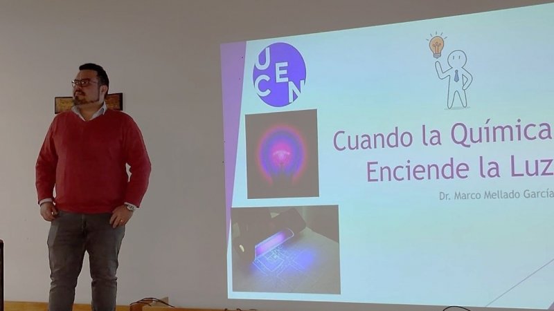 Como parte de las actividades de divulgación científica y vinculación con el medio, el Dr. Mellado presentó la ponencia titulada “Cuando la química enciende la luz”, en la cual compartió su experiencia en el desarrollo de sensores colorimétricos y fluorescentes que se utilizan en en la detección de metales con relevancia fisiológica y pH intracelular.