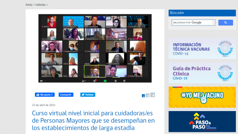 El Ministerio de Salud en colaboración con la Sociedad Chilena de Geriatria y Gerontología realizó la inauguración de la primera versión del curso virtual nivel inicial para cuidadoras/es de Personas Mayores que se desempeñan en los establecimientos de larga estadía. La académica de la carrera de Enfermería Carolina Núñez, participó en el Curso para Cuidadoras, en el módulo 1 y con el tema Envejecimiento saludable, activo y positivo.