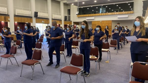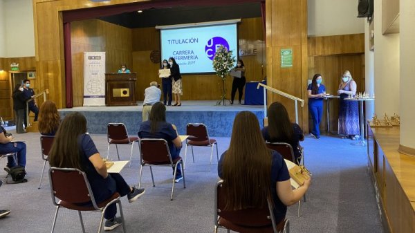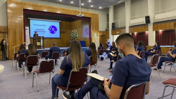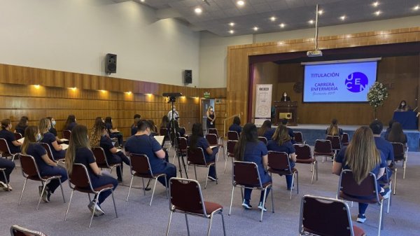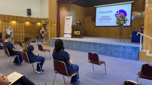 El pasado viernes 12 de noviembre se realizó la ceremonia de titulación de la carrera de Enfermería de la generación 2019. Debido a los protocolos por el COVID-19, el solemne acto estuvo dividido en dos horarios para respetar los aforos y además fue transmitida por el Fan Page de la Facultad de Ciencias de la Salud.