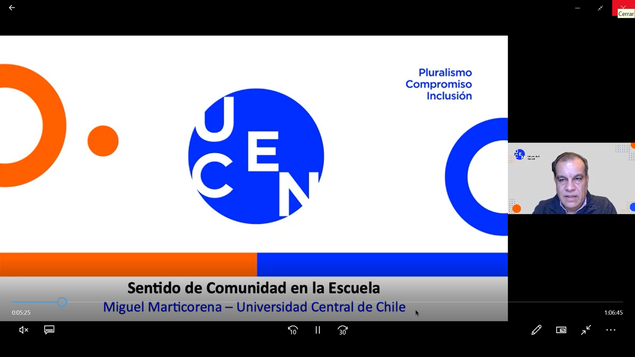 En el marco del Ciclo de Seminarios Internacionales: Bienestar en Comunidades Educativas se realizó el último Seminario Sentido de Comunidad en la Escuela y el Barrio el martes 27 de julio 17.00 hrs. Chile 16.00 hrs. Perú y Colombia. El seminario virtual contó con las exposiciones del profesor Dr© Miguel Marticorena de la Universidad Central de Chile, el académico. Mg. José Manuel Delgado de la Universidad Científica del Sur – Perú y la moderación del Mg. Felipe Agüero de la Universidad Central de Chile.