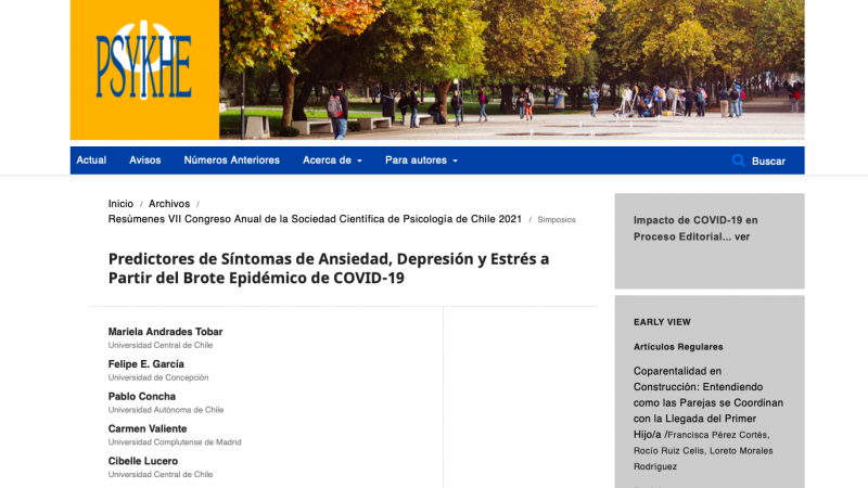 La Dra. Mariela Andrades, académica de la carrera de Psicología de nuestra universidad Central de Chile, publica resumen de simposio, denominado “Predictores de Síntomas de Ansiedad, Depresión y Estrés a Partir del Brote Epidémico de COVID-19”, el cuál fue presentado en el VII congreso anual de la Sociedad Científica de Psicología de Chile 2021 el que se realizó en conjunto con la Universidad de Concepción. Los resúmenes fueron publicados en la Revista Psykhe de la Escuela de Psicología de la Facultad de Ciencias Sociales de la Pontificia Universidad Católica de Chile.