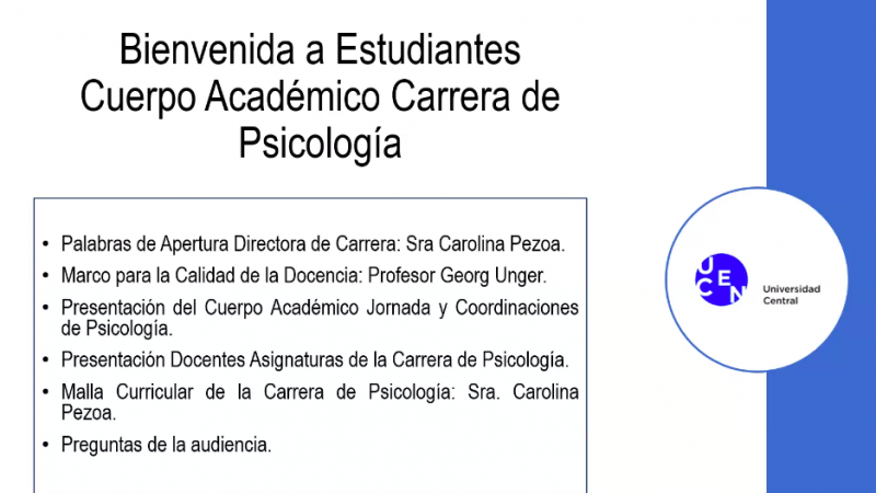El profesor Georg Unger explicó el marco para la calidad de la docencia de la carrera, luego se realizó la presentación del cuerpo académico jornada y coordinaciones de Psicología, para finalizar con las dudas y preguntas de los nuevos estudiantes.