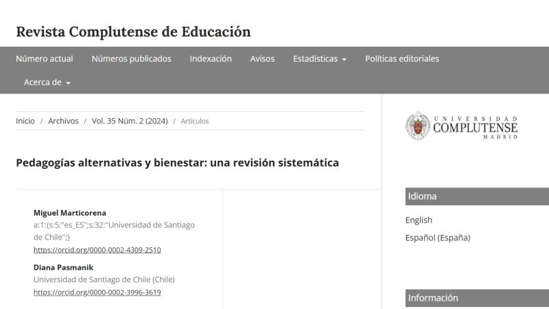 La Revista Complutense de Educación publicó el articulo desarrollado por el psicólogo, académico de la Facultad de Medicina y Ciencias de la Salud, Miguel Marticorena, sobre pedagogías alternativas y bienestar. Se trata de una revisión sistemática de la literatura publicada desde el año 2018 a junio 2022 sobre el tema respecto de los estudiantes preescolares y escolares