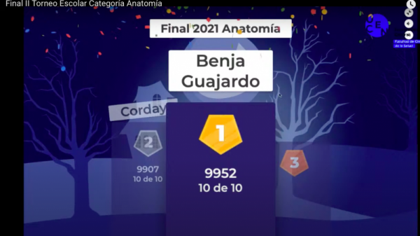 El cuarto lugar de la contienda, fue para Francisco Burgos alumno de cuarto medio del colegio Liceo Bicentenario Enrique Ballacey Cottereau de Angol, el tercer lugar fue para Karin Donoso, quien también obtuvo el mismo puesto en la categoría Histología. El segundo lugar fue para el estudiante de cuarto medio Cristóbal Corday del Instituto Nacional, quien además fue ganador de la categoría Histología. El primer lugar quedó en manos del estudiante Benjamín Alejandro Guajardo del Instituto San Pablo Misionero.