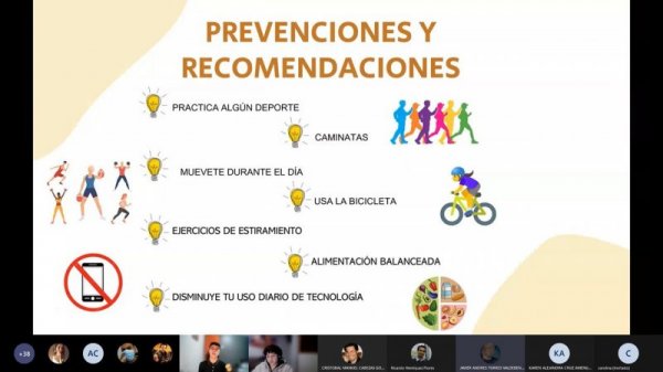 Como parte del proyecto de Vinculación con el Medio adjudicado por las carreras de Kinesiología y Nutrición y Dietética, el pasado jueves 1 de julio se llevó a cabo el taller educativo de estilos de vida saludable contextualizados en pandemia. Esta actividad contó con la participación de cerca de 40 estudiantes de ambas carreras, los cuales expusieron recomendaciones relacionadas a la adopción de estilos de vida saludables, en contextos de pandemia, a familias de la Escuela Caminito de la comuna de El Bosque.