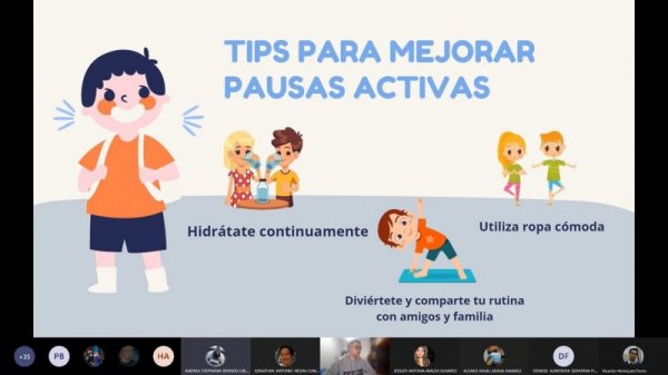 La Jornada comenzó con una exposición interactiva de la carrera de Nutrición y Dietética, la cual hizo referencia a alimentación saludable y recomendaciones para su implementación en contextos de pandemia, posteriormente vino el turno de los estudiantes de kinesiología, quienes expusieron sobre las temáticas de: Sedentarismo e inactividad física, ergonomía en telestudio, pausas activas y ejercicios de fuerza y resistencia. En cada una de las presentaciones se realizó una actividad interactiva donde el público en general pudo poner a prueba sus conocimientos, practicar ejercicios y estiramientos recomendados para espacios reducidos, y desafíos físicos para los escolares.