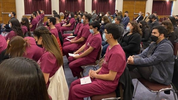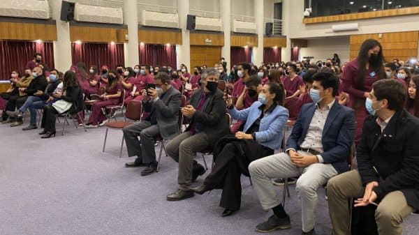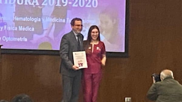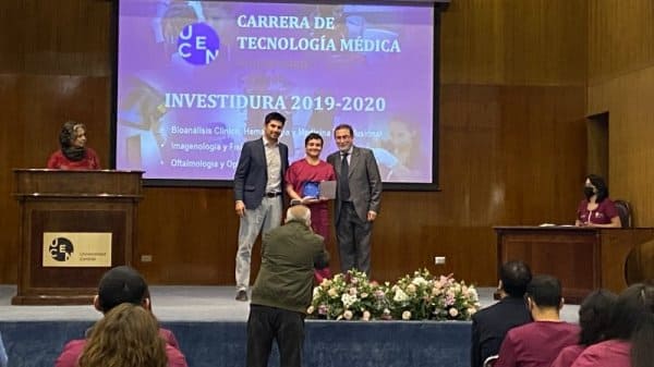 El coordinador de la especialidad de Bioanálisis Clínico, Hematología y Medicina Transfusional profesor Rodrigo Munizaga Ramos, entregó un reconocimiento al mejor rendimiento de la generación 2019 durante el ciclo básico al estudiante Matías Ahumada Morales. El segundo premio fue para la estudiante que obtuvo el mejor rendimiento de la generación 2020 durante el ciclo básico Daniela Salazar Carrasco.