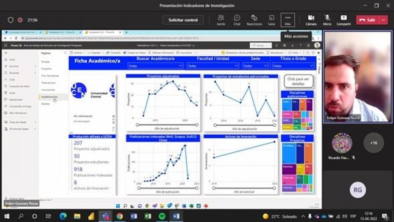 Al respecto, la autoridad agregó que “la actividad tenía como fin visualizar la productividad académica de nuestra comunidad universitaria. La plataforma permite visualizar el avance en productividad que ha tenido la institución en el último quinquenio, así como los detalles de proyectos adjudicados y áreas de actividad de investigación”.
