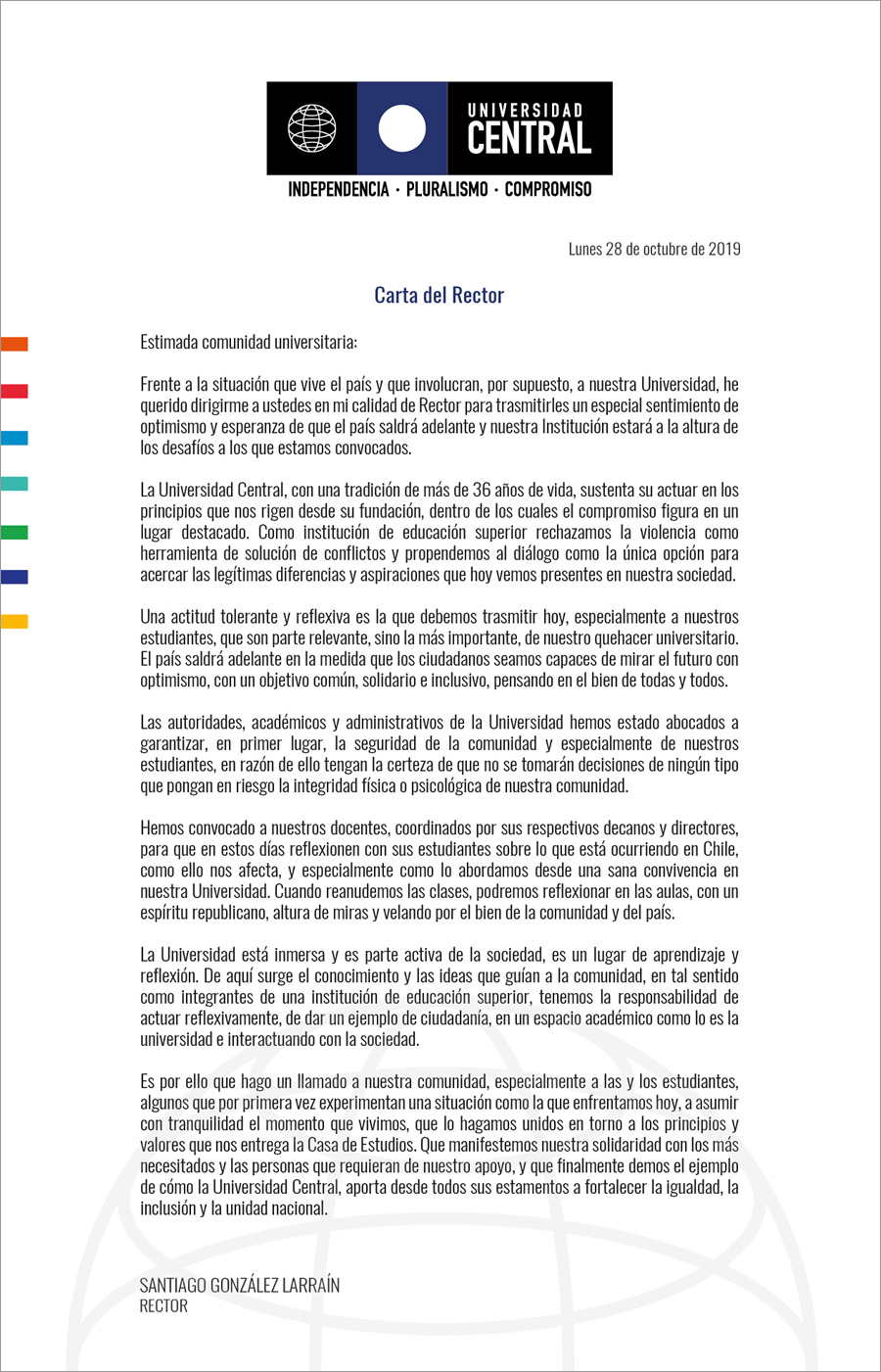 Santiago González Larraín, Rector de la Universidad Central de Chile, expresa su opinión frente a los acontecimientos que vive el país.