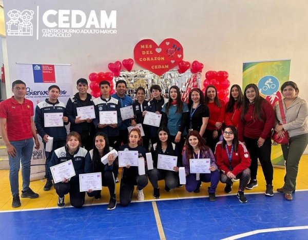 Para finalizar el mes del corazón, la oficina de Deportes de la I.Municipalidad de Andacollo en conjunto con el Centro Diurno para Adulto Mayor (CEDAM) invitó a la carrera de Pedagogía en Educación Física para apoyar una actividad dirigida a 60 adultos mayores en prevención de enfermedades cardiovasculares.