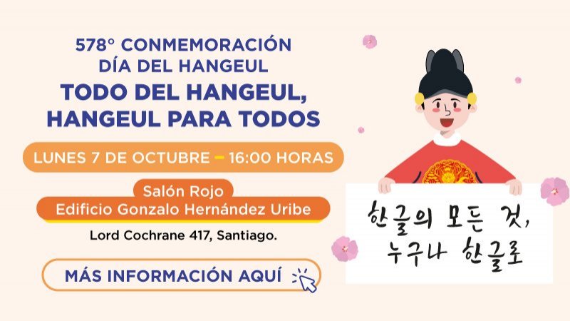 El Instituto Rey Sejong Santiago invita a todos los interesados en la cultura coreana a una serie de actividades especiales para conmemorar el Día del Hangeul. Este evento promete ser una excelente oportunidad para explorar y apreciar la lengua y la cultura coreana.
