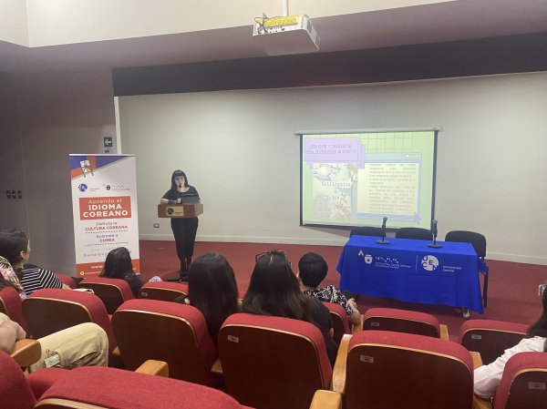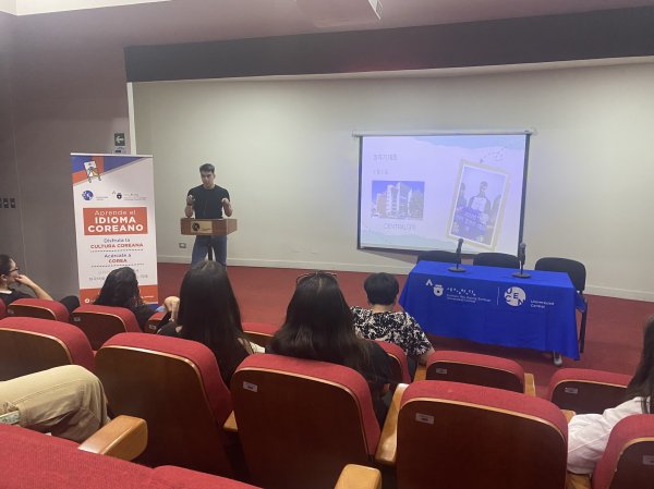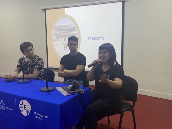 La jornada continuó con la presentación de Mario Velásquez y Sofía Fajardo, estudiantes del Magíster en Estudios Coreanos. Mario, por su lado, realizó una exposición sobre la investigación “Explorando Corea del Sur, una primera aproximación”, enfocado en la exploración de espacios públicos, movilidad y turismo en diferentes ciudades de Corea. Y Sofía, por su parte, habló sobre su proyecto podcast llamado “Soliloquios a pie”, en el que ahondó sobre las artes escénicas coreanas, cultura tradicional e historia retratada en las diferentes zonas urbanas que visitó.