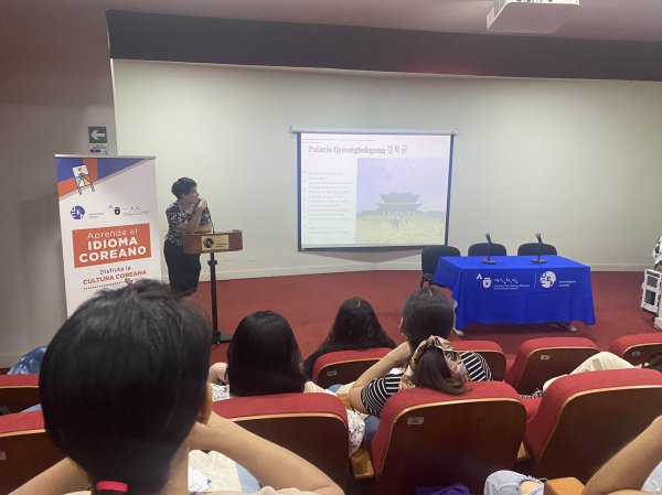 Luego, el seminario tuvo la participación de Juan Eduardo Bustos, estudiante del curso intermedio 1A del Instituto, y quien recientemente participó en el programa “Experiencia Cultural en Corea para Estudiantes Sobresalientes de KSI 2023” de la Fundación Instituto Rey Sejong. Este programa exclusivo, que tuvo lugar en Corea del Sur, fue el premio que recibió tras obtener el primer lugar en el Concurso de Oratoria en Coreano 2023. En su exposición, Juan Eduardo nos comentó sobre su visita al Museo del Hangeul y los diversos lugares tradicionales que pudo conocer mientras compartía con 168 estudiantes de 67 países que cuentan con Institutos Rey Sejong.