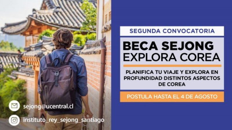 El Instituto Rey Sejong Santiago de la Universidad Central te invita a postular a la Beca Sejong Explora Corea. Gracias a esta beca, podrás realizar una estadía en dicho país, con el propósito de ejecutar un proyecto de investigación enfocado en la exploración del país, en diversos aspectos como lo son la cultura, idioma, sociedad, política, vida diaria, entre otros. La beca tiene como objetivo otorgar un financiamiento parcial de los costos asociados a la estadía en Corea de los y las estudiantes de la UCEN.