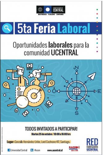 Conectar a los estudiantes y egresados de la Universidad Central, con una importante red de empresas a fin de propiciar su acceso a las mejores condiciones de empleabilidad, es el gran objetivo de la V Feria Laboral 2016, organizada por la Facultad de Ciencias Económicas y Administrativas (FACEA) y la Dirección de Comunicaciones Corporativas, y que se llevará a cabo el martes 25 de octubre, de 10:00 a 16:00 horas en dependencias del edificio Gonzalo Hernández Uribe, ubicado en Lord Cochrane 417.