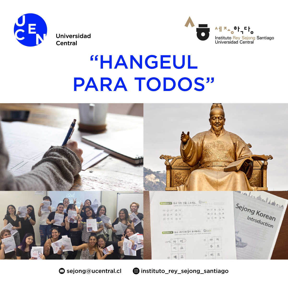 HANGEUL PARA TODOS Clases especiales y gratuitas, que están abiertas para todas las personas, mayores de 18 años, que estén interesadas en dar el primer paso al idioma coreano, aprendiendo el alfabeto coreano, Hangeul, desde cero. Esta iniciativa tiene como objetivo brindar la oportunidad a cualquier persona de acercarse a Corea, a través de su idioma. |