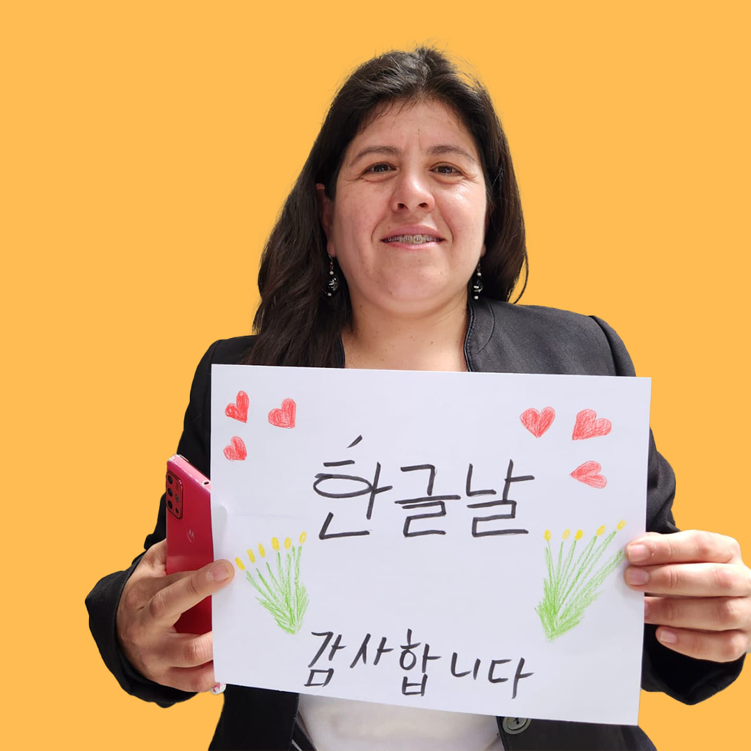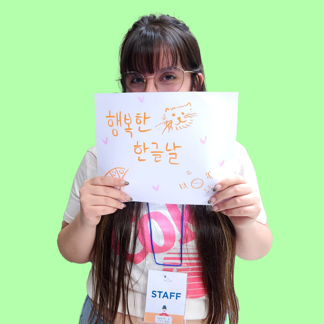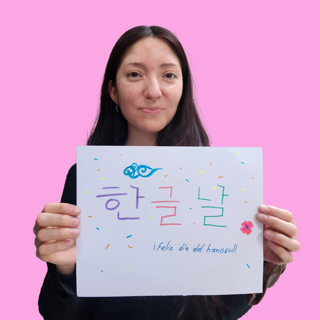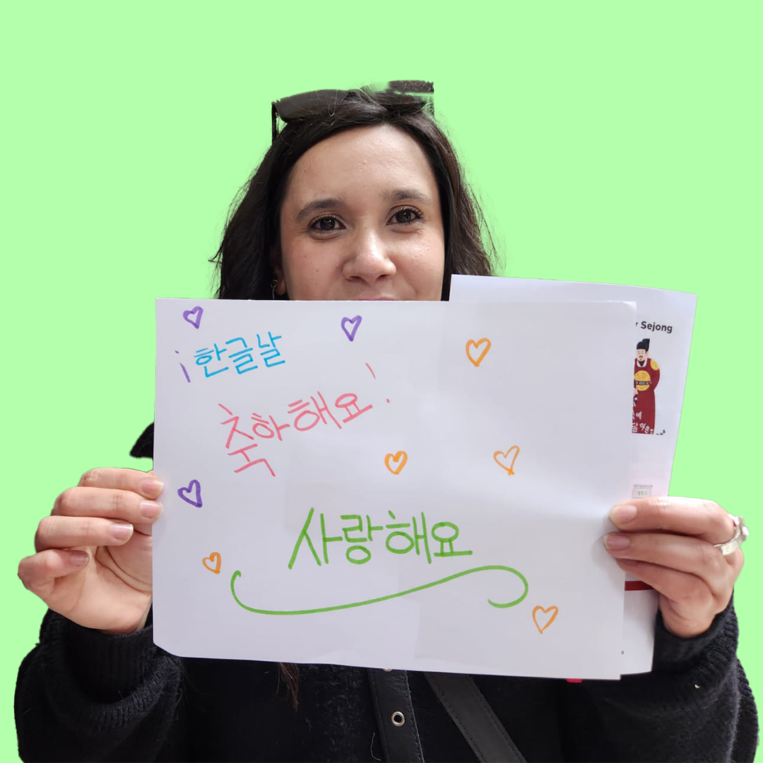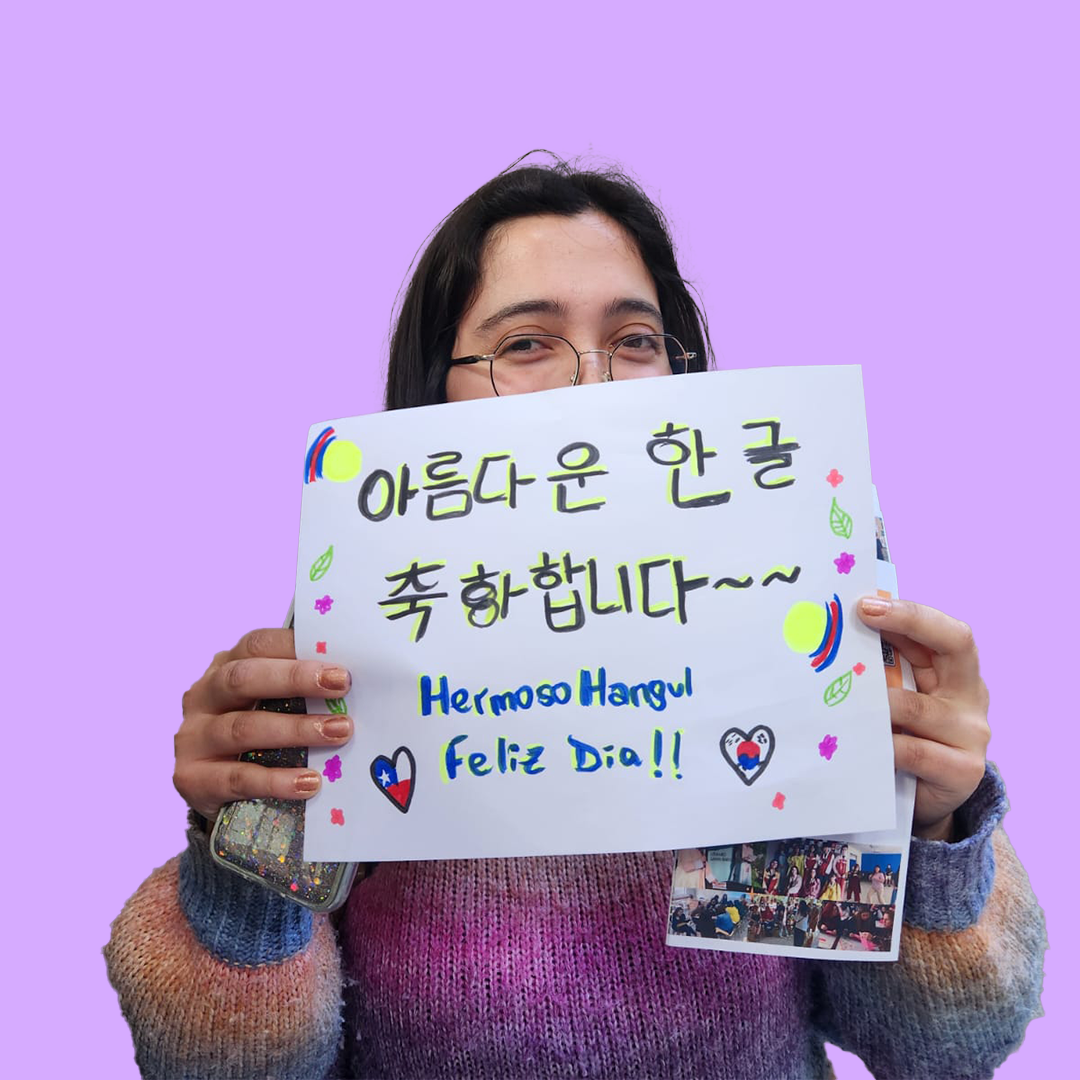 El mural "Día del Hangeul" es un lienzo digital que se creó a partir de las fotografías tomadas de los asistentes en el stand de pancartas durante la celebración del Día del Hangeul 2024. En cada pancarta, los participantes expresaron sus saludos y felicitaciones en conmemoración de los 578 años de la proclamación del alfabeto coreano, el hangeul. Este mural no solo celebra la rica historia del hangeul, sino que también refleja la participación activa y el entusiasmo de la comunidad en este importante evento cultural.