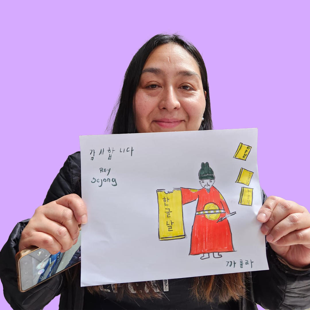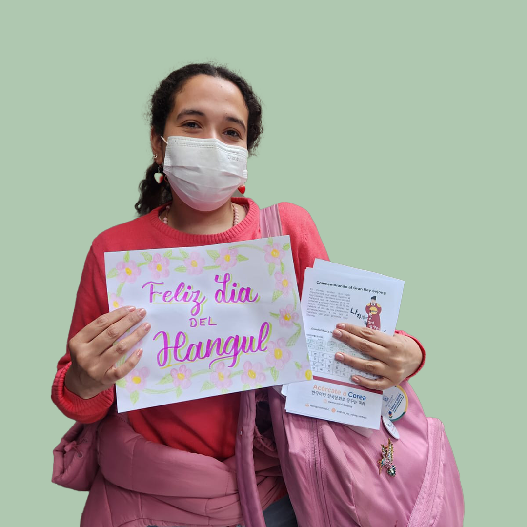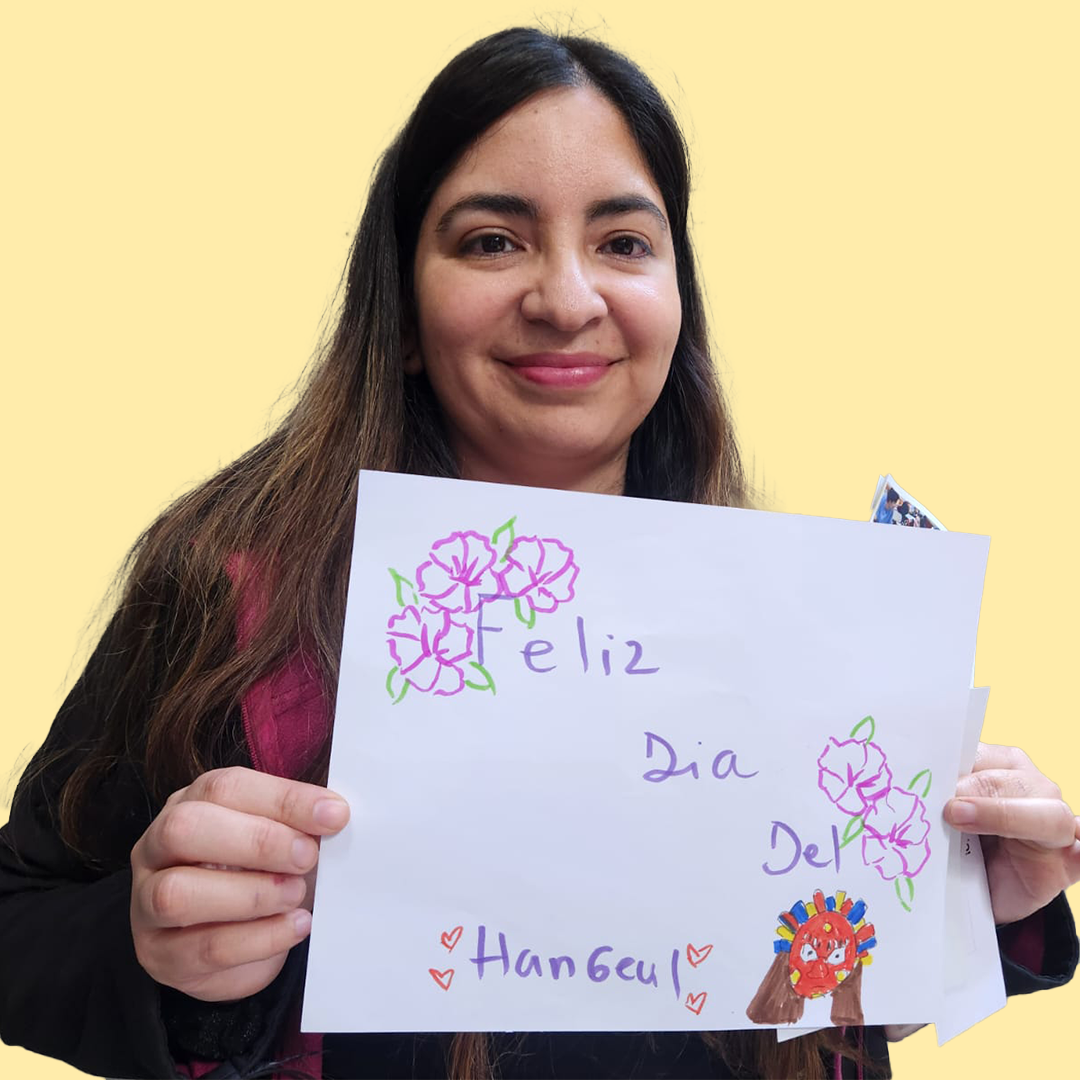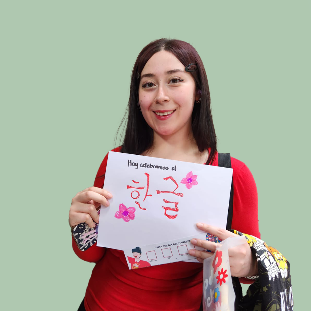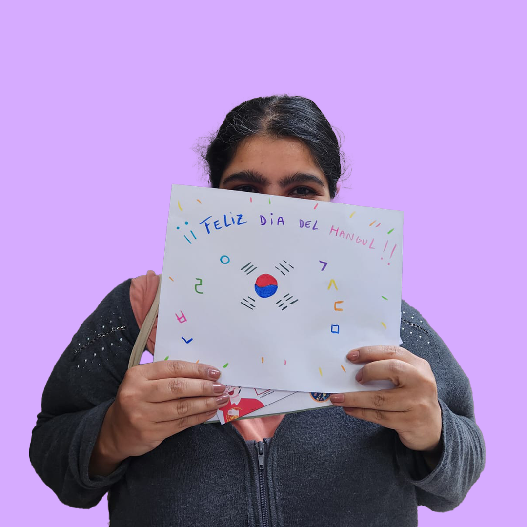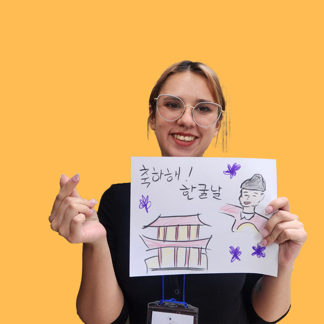 El mural "Día del Hangeul" es un lienzo digital que se creó a partir de las fotografías tomadas de los asistentes en el stand de pancartas durante la celebración del Día del Hangeul 2024. En cada pancarta, los participantes expresaron sus saludos y felicitaciones en conmemoración de los 578 años de la proclamación del alfabeto coreano, el hangeul. Este mural no solo celebra la rica historia del hangeul, sino que también refleja la participación activa y el entusiasmo de la comunidad en este importante evento cultural.