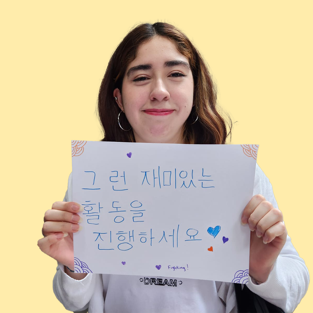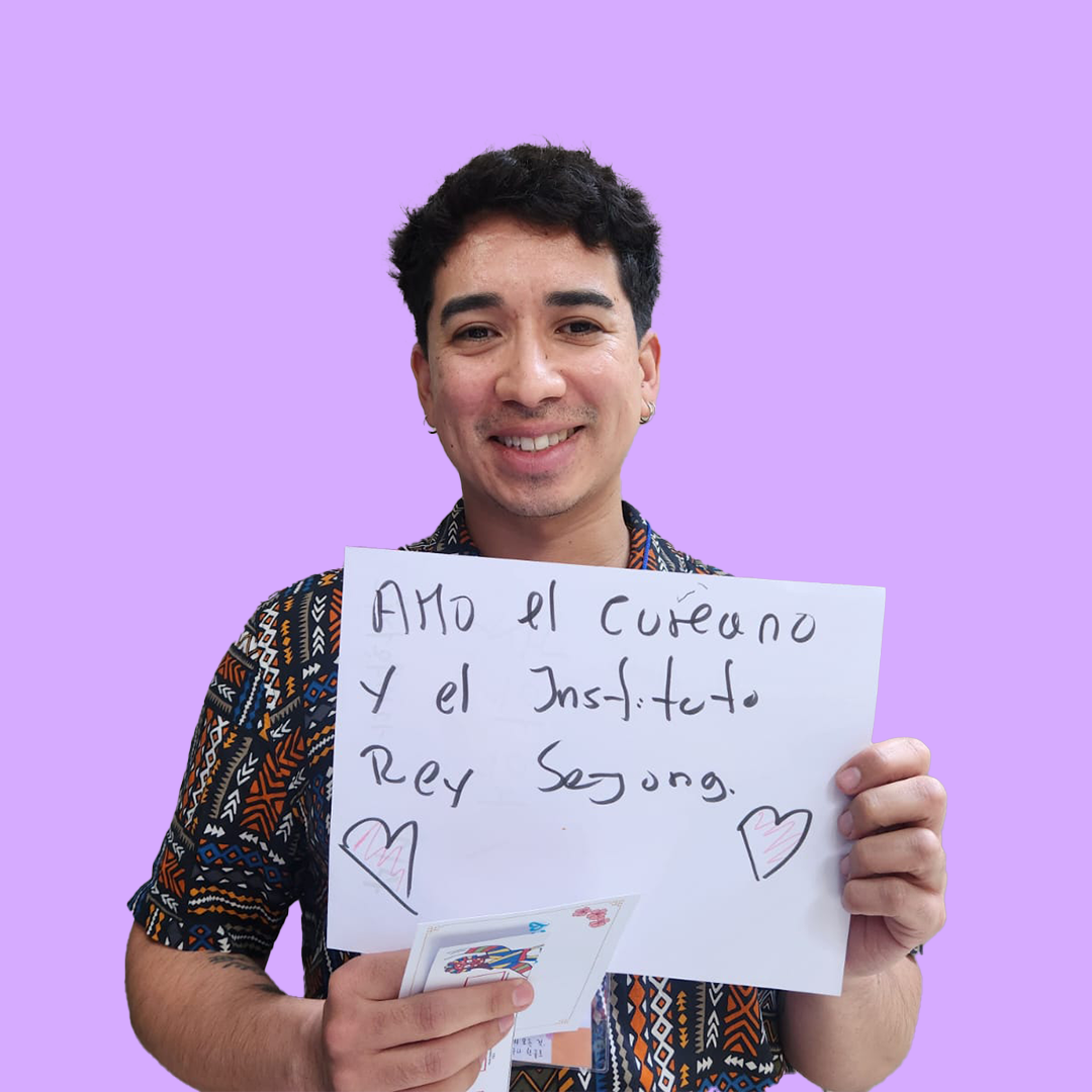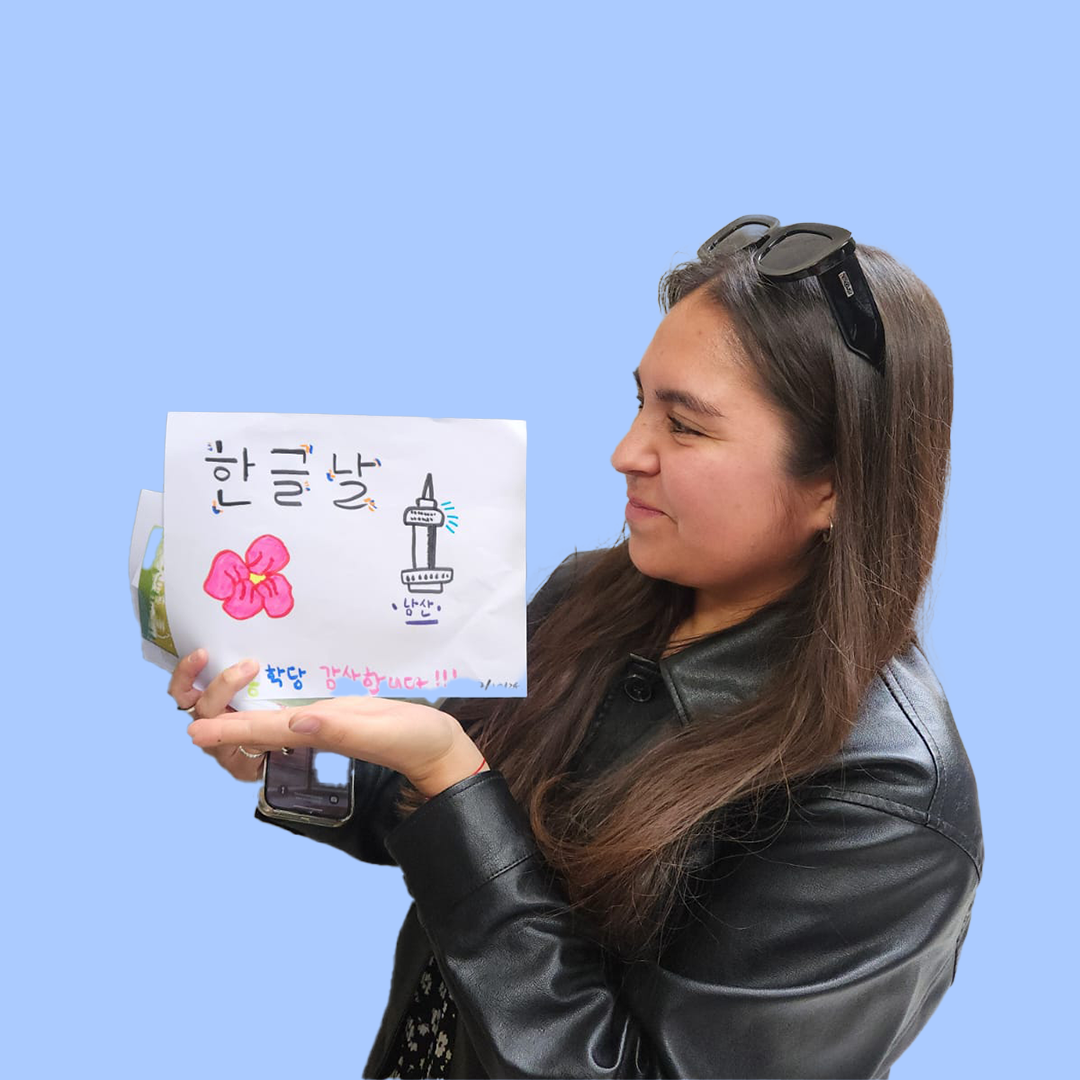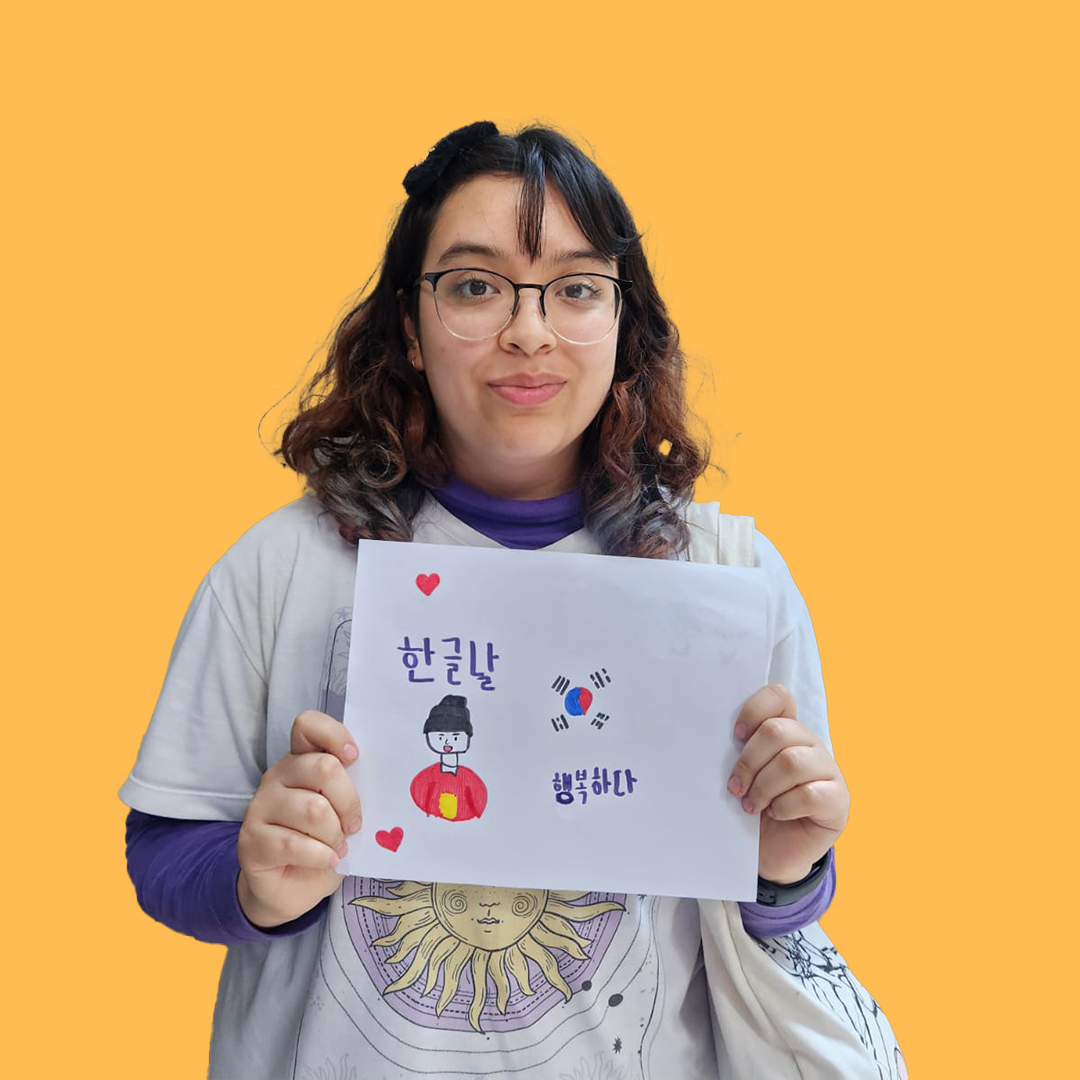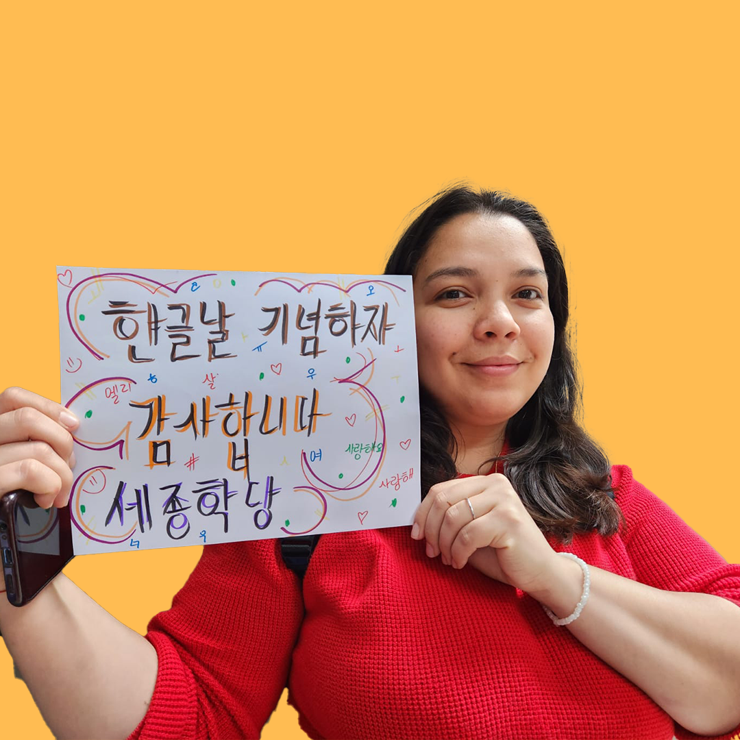 El mural "Día del Hangeul" es un lienzo digital que se creó a partir de las fotografías tomadas de los asistentes en el stand de pancartas durante la celebración del Día del Hangeul 2024. En cada pancarta, los participantes expresaron sus saludos y felicitaciones en conmemoración de los 578 años de la proclamación del alfabeto coreano, el hangeul. Este mural no solo celebra la rica historia del hangeul, sino que también refleja la participación activa y el entusiasmo de la comunidad en este importante evento cultural.