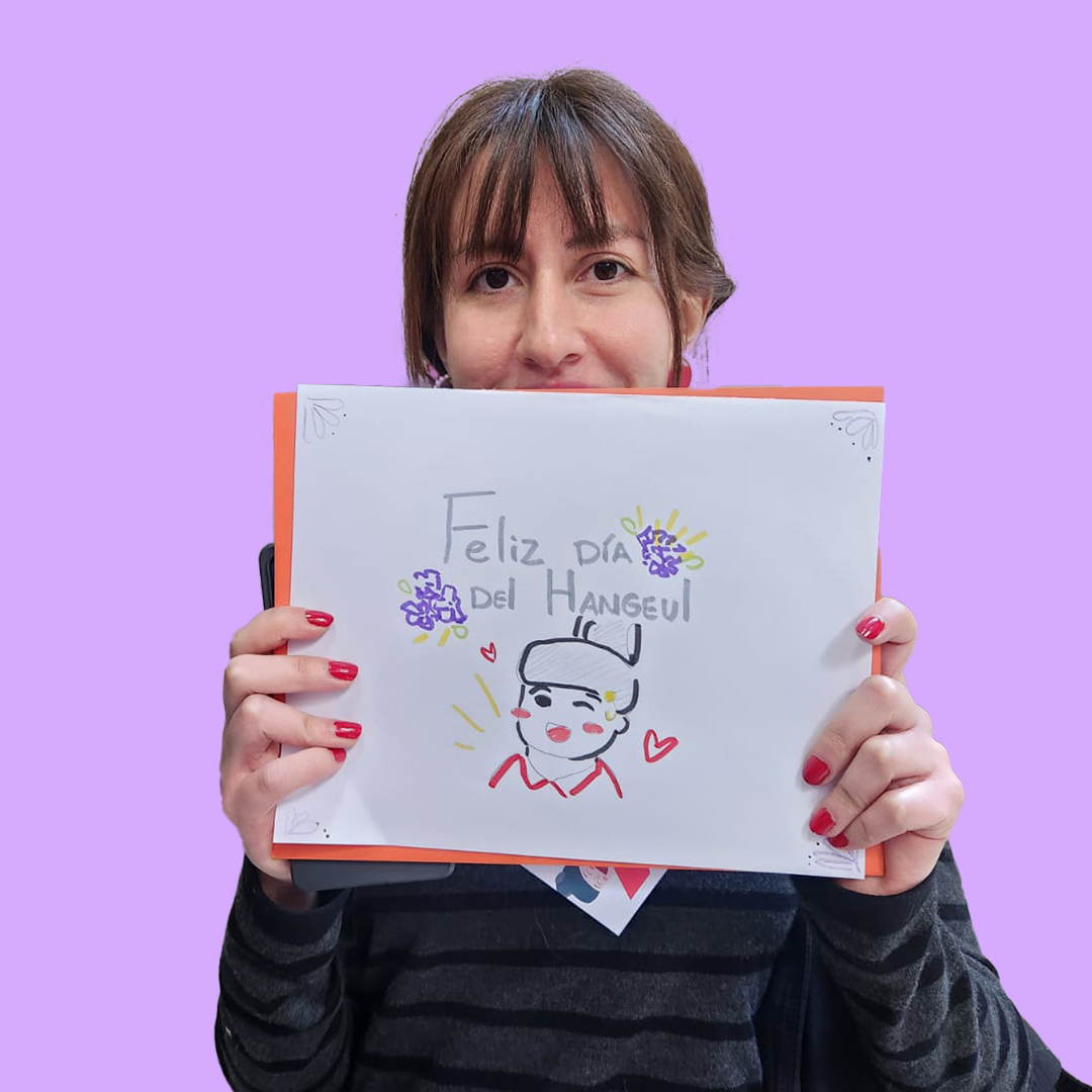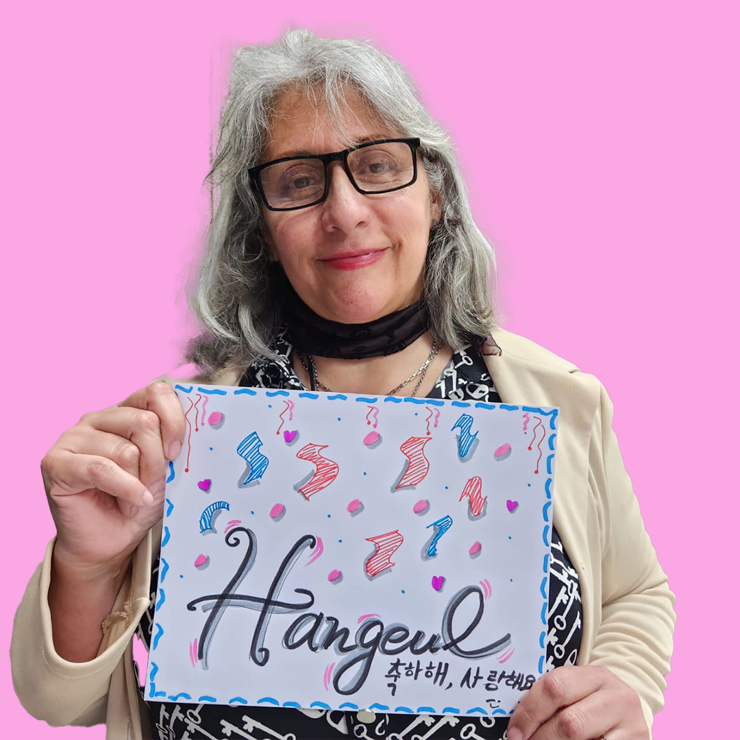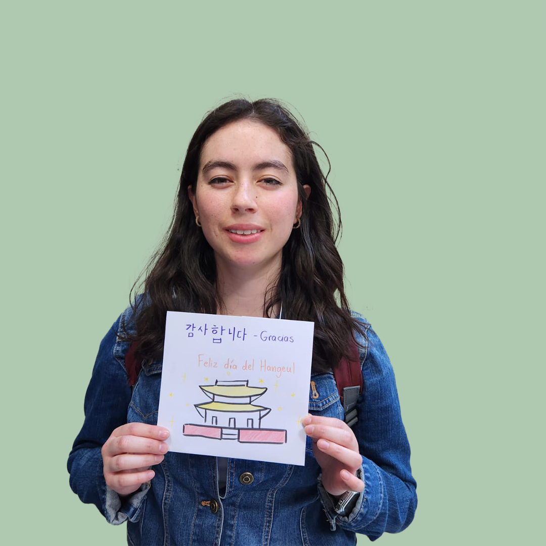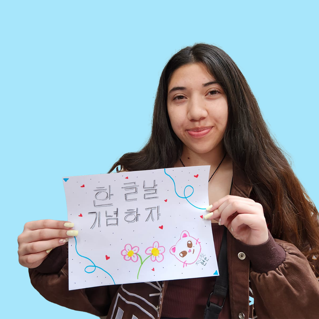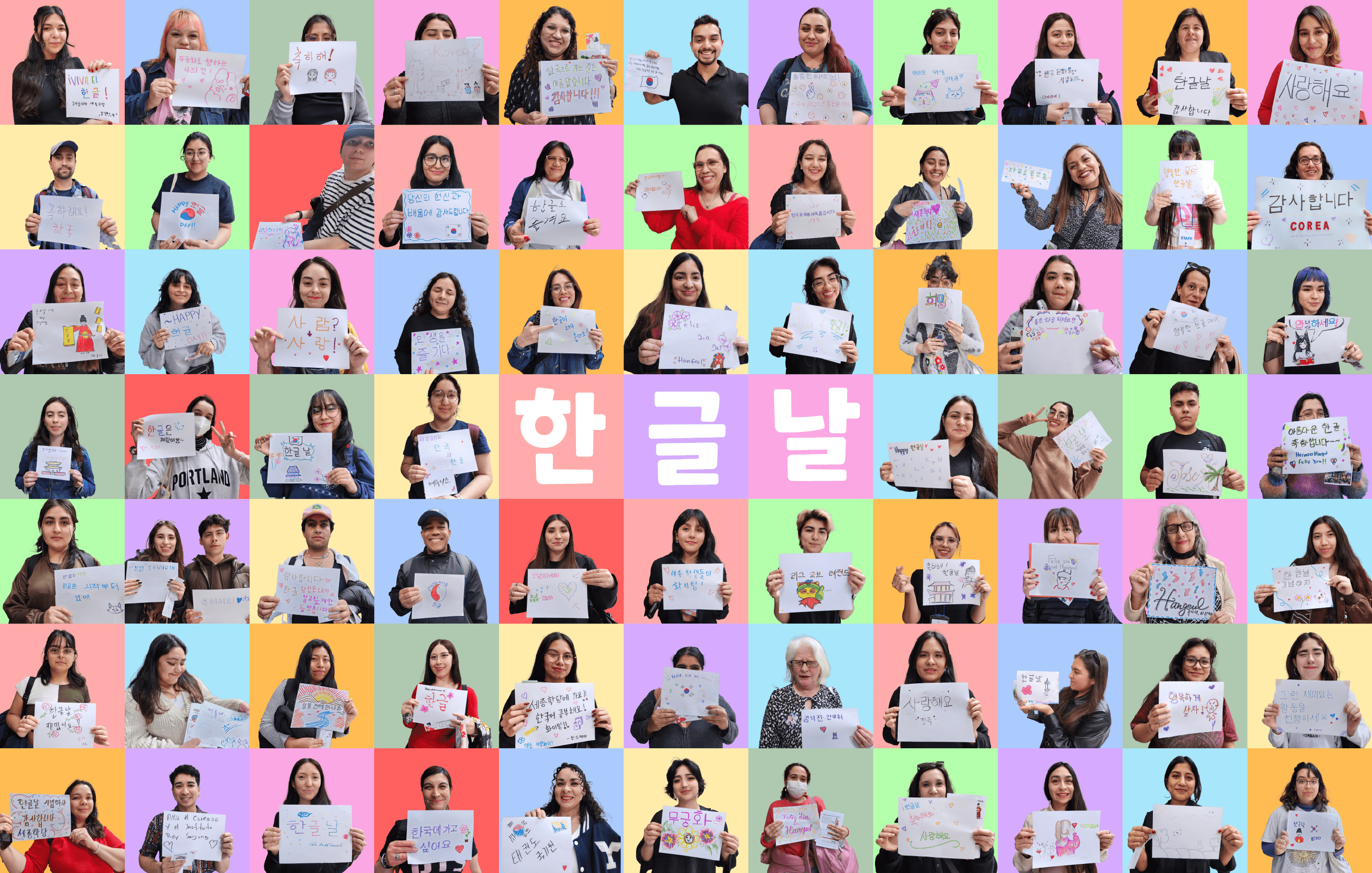 El mural "Día del Hangeul" es un lienzo digital que se creó a partir de las fotografías tomadas de los asistentes en el stand de pancartas durante la celebración del Día del Hangeul 2024. En cada pancarta, los participantes expresaron sus saludos y felicitaciones en conmemoración de los 578 años de la proclamación del alfabeto coreano, el hangeul. Este mural no solo celebra la rica historia del hangeul, sino que también refleja la participación activa y el entusiasmo de la comunidad en este importante evento cultural.