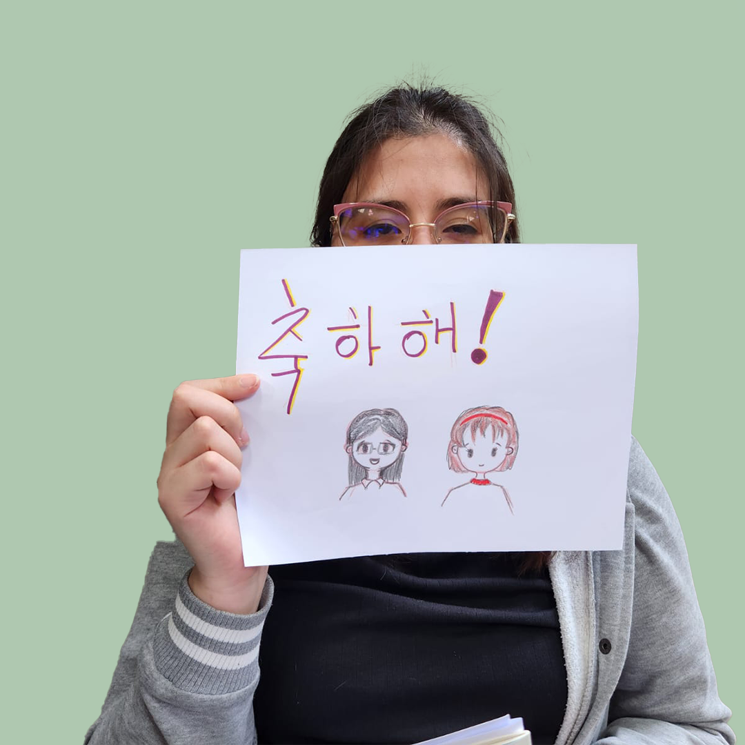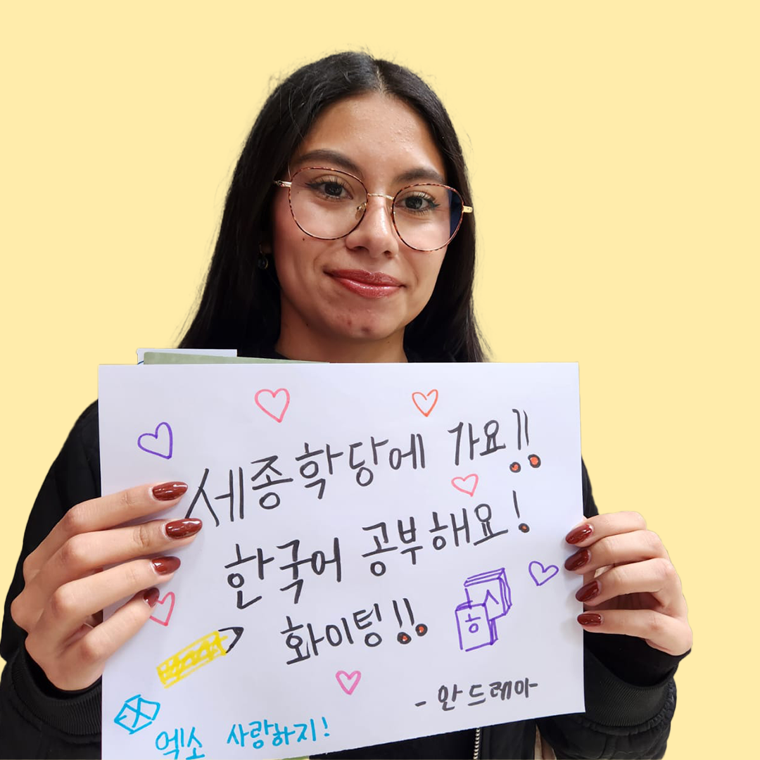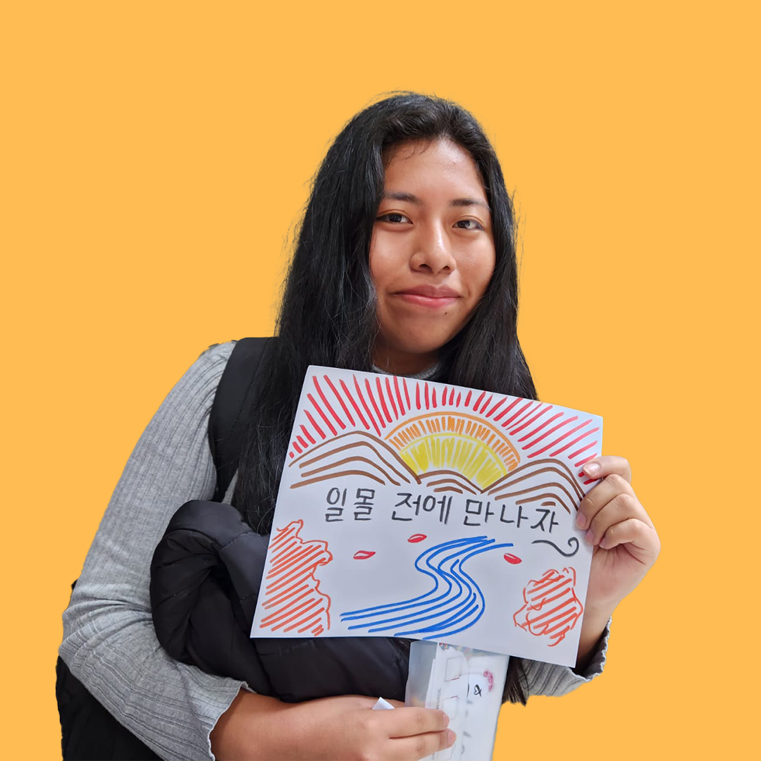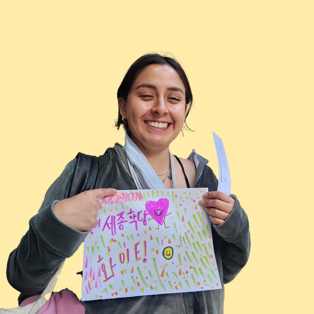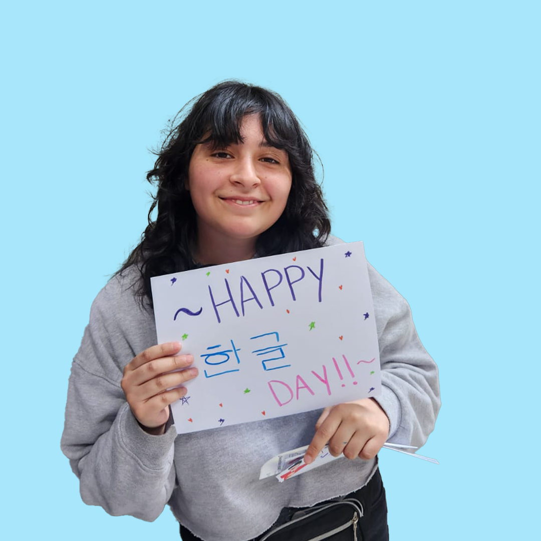 El mural "Día del Hangeul" es un lienzo digital que se creó a partir de las fotografías tomadas de los asistentes en el stand de pancartas durante la celebración del Día del Hangeul 2024. En cada pancarta, los participantes expresaron sus saludos y felicitaciones en conmemoración de los 578 años de la proclamación del alfabeto coreano, el hangeul. Este mural no solo celebra la rica historia del hangeul, sino que también refleja la participación activa y el entusiasmo de la comunidad en este importante evento cultural.