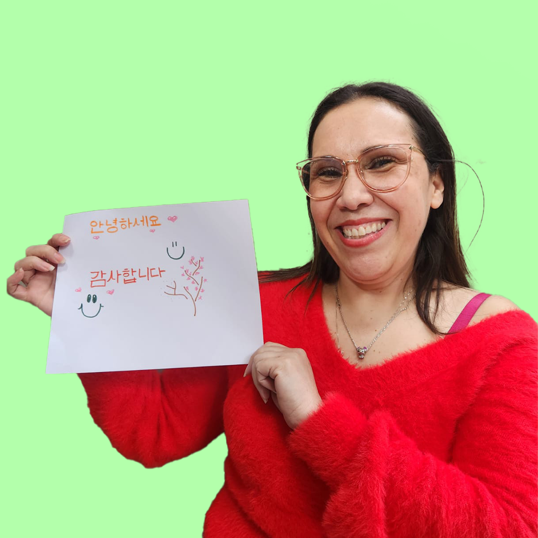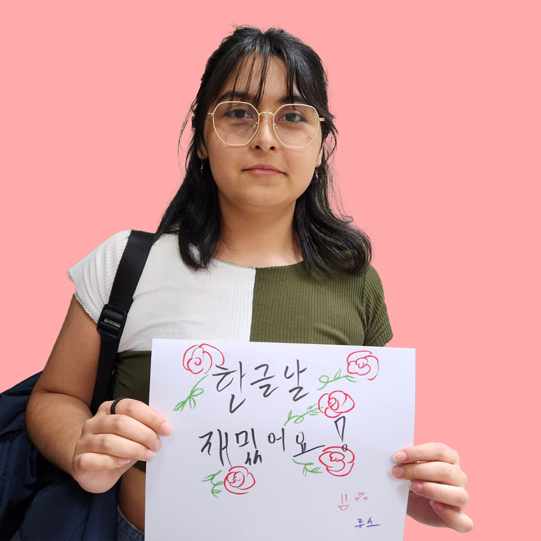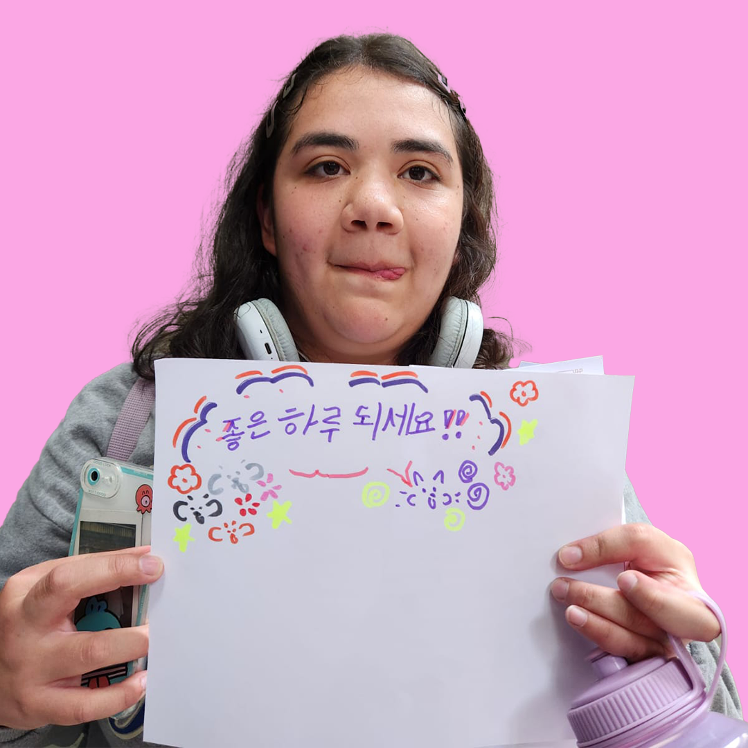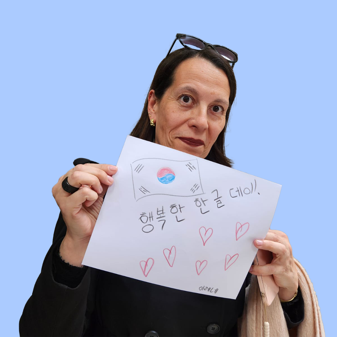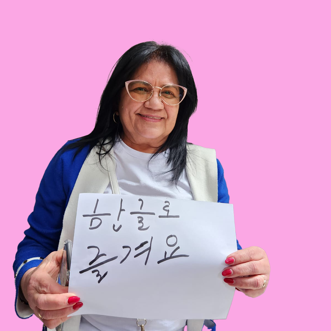 El mural "Día del Hangeul" es un lienzo digital que se creó a partir de las fotografías tomadas de los asistentes en el stand de pancartas durante la celebración del Día del Hangeul 2024. En cada pancarta, los participantes expresaron sus saludos y felicitaciones en conmemoración de los 578 años de la proclamación del alfabeto coreano, el hangeul. Este mural no solo celebra la rica historia del hangeul, sino que también refleja la participación activa y el entusiasmo de la comunidad en este importante evento cultural.