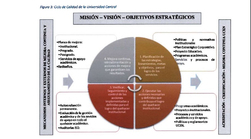 Como parte del Sistema de Aseguramiento de la Calidad, la UCEN define como una herramienta estratégica y de gestión de la mejora continua, la implementación y desarrollo de un ciclo de calidad cuya finalidad es planificar, ejecutar, evaluar y retroalimentar. Éste, considera las orientaciones y elementos definidos que contribuyen al logro de los propósitos institucionales, garantizando el cumplimiento significativo de las metas y de los resultados esperados, lo que se expresa en procesos como las acreditaciones ante la CNA, organismos internacionales, la evaluación interna de programas y carreras, las certificaciones ISO 9001:2015, entre otros.