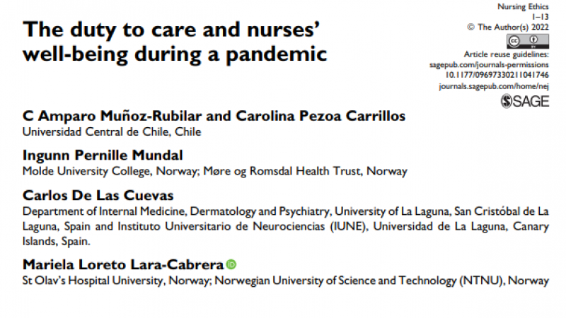 El deber de cuidar es la línea de trabajo e investigación doctoral en Ciencias de la Salud de la académica Amparo Muñoz-Rubilar quien ya ha realizado publicaciones en revistas de alto nivel relacionadas a este tema. Este año, en conjunto con la académica Carolina Pezoa Carrillos, ha logrado un importante hito publicando en la revista de más alta difusión e impacto del tema Nursing Ethics
