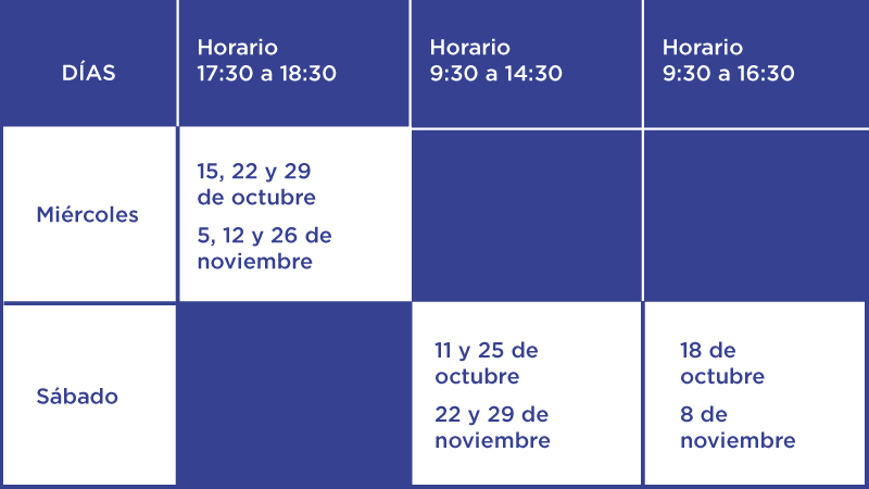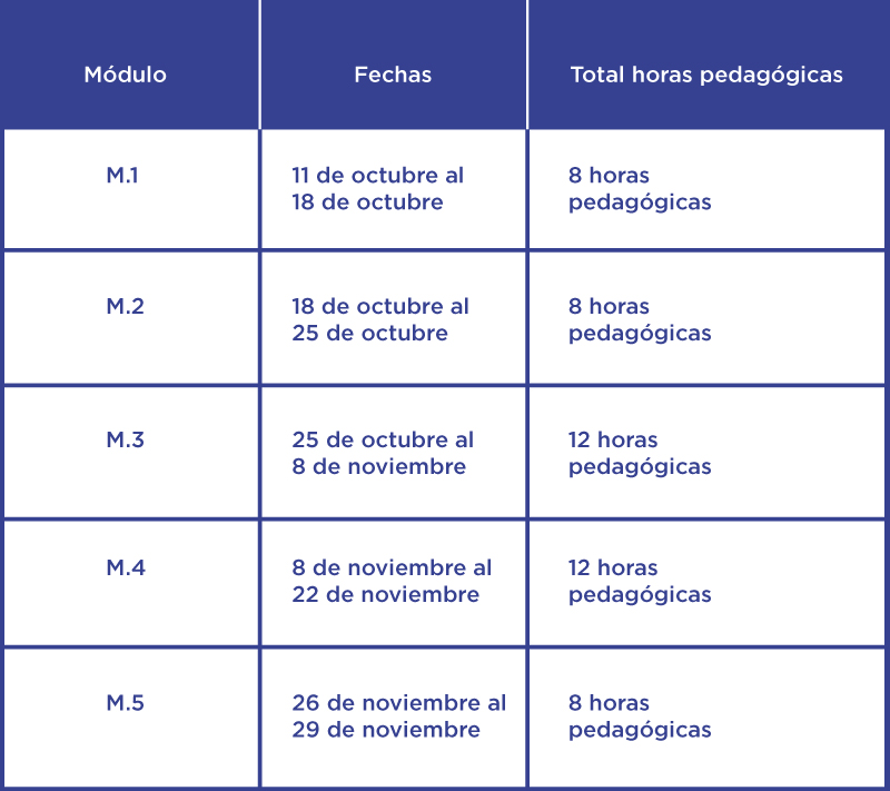 Nota: los y las participantes seleccionados al programa contarán con una merienda los días sábados.Calendario módulos
